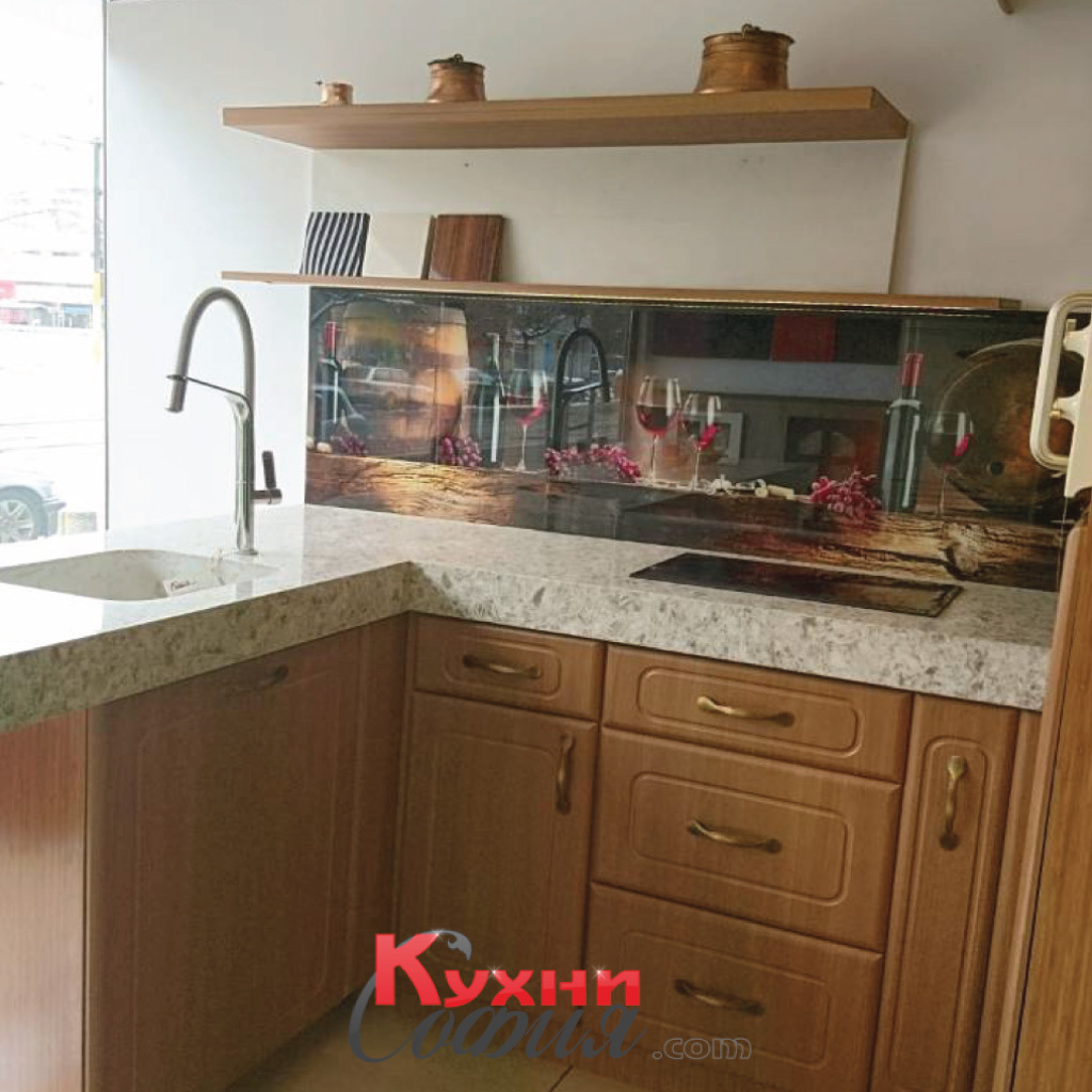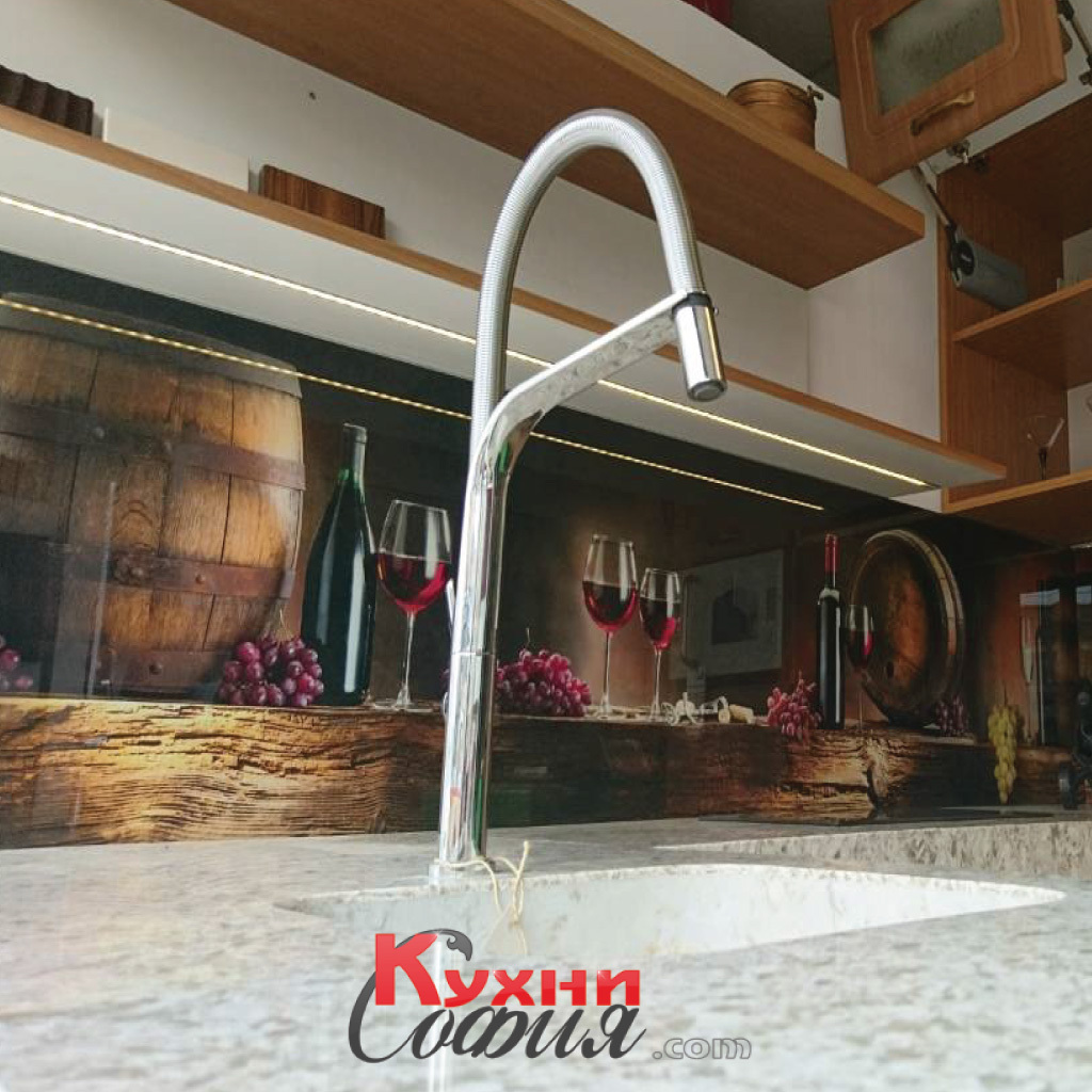 Весела и екстравагантна кухня, подходяща както за следобедно кафе на бар-плота от технически камък, така и за вкусни кулинарни изпълнения. Съчетанието на свободни етажерки с колона предоставя достатъчно място за съхранение без да отежнява композицията. Картината се завършва от принт стъкло, подчертано с осветление. Можете да я разгледате в шоурума ни, за да зарадва и вас!